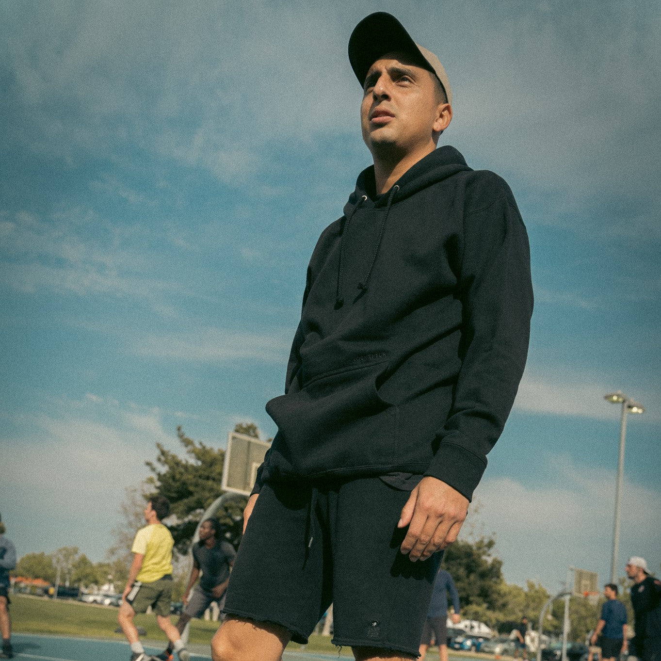 The quintessential black hoodie, I’m soul bonded to them. Growing up in sketchy neighborhoods, the unwritten rule is if someone has a hoodie on, you leave 'em alone. I normally try to hoop in a flow state and the hoodie helps me focus on the way to the court. I asked people about logos and they said they don’t like ‘em so we put a small one above the pocket to keep quiet and let you think and flow and forget about the stupid life stuff we go through. Wear it after late-night outdoor runs cause’ being sweaty in a cold wind sucks. Along with SHORTS 1 and SHIRT 4, we curated a sleek monochromatic look for people who like to avoid attention. Wash it cold and hang it dry so the color doesn’t fade.